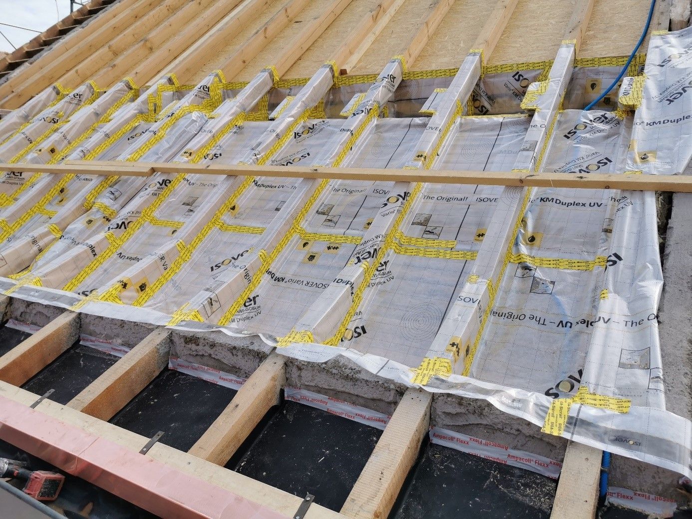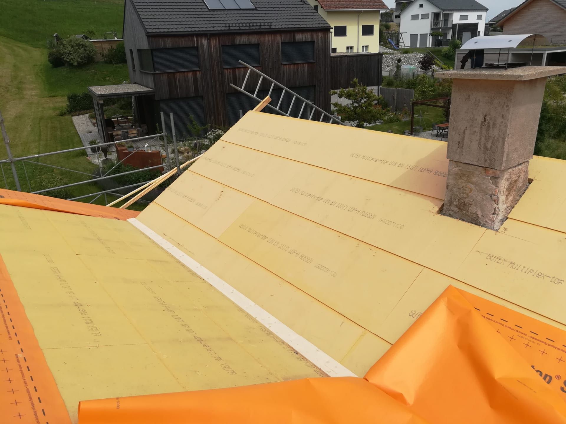 Hochwertige und wetterbeständige Konstruktionen mit konsequentem Aufbau sorgen für eine optimale Wärmedämmung: auf der Dachschalung aufgebrachte Dampfsperre, Isolation kreuzweise, Unterdach, Konterlattung, Dachlatten und Ziegel.